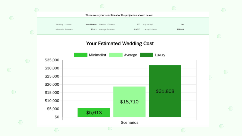 Using data from The Knot, Zola, and Fidelity, we created a projection tool to highlight the average cost of a wedding in every state and what you might expect if you’re budgeting on the lower or higher end. With Tulle, you can estimate your wedding cost based on location and guest count, tailoring your budget to your specific needs. Below, we’ve highlighted the average costs for weddings with 100 guests in both the top 5 most and least expensive states (Note: each state has the ‘major city’ filter applied, which can be toggled off in Tulle). To fill in your own projections and explore how wedding costs vary by location and guest count, sign up for Tulle here.