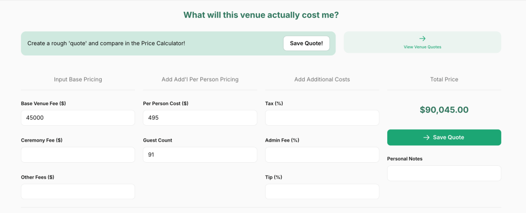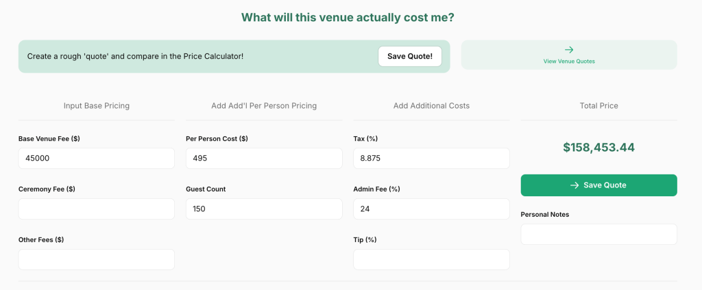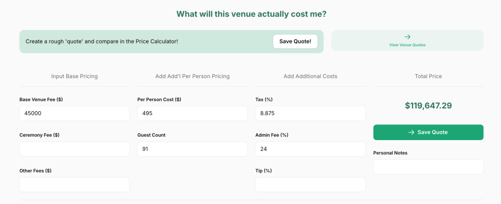 We’ll start with some total numbers before breaking down each fee individually. We combed through all the pricing details in the PDF to put together some high level quotes using Tulle’s Venue Calculator tool. This tool allows you to put in the most common elements of venue pricing PDFs to figure out the actual total without having to build a complex spreadsheet. You can try it out yourself by logging in to TulleTogether.com!