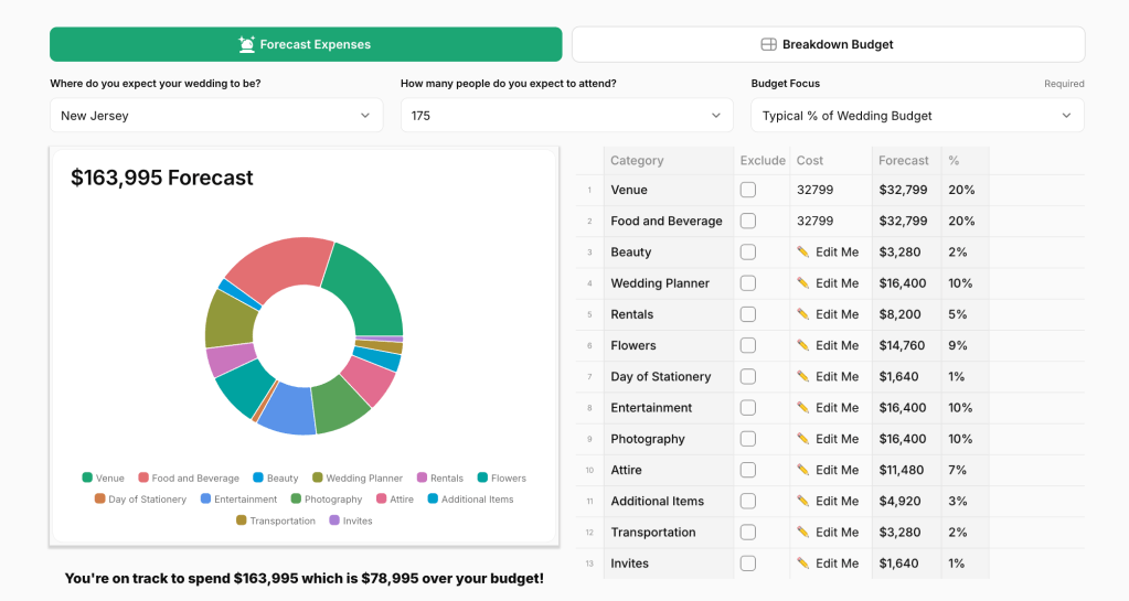 The Cost Forecast Tool is just one of Tulle Together’s budgeting resources. On the website, you’ll find a variety of budget tools designed to help couples plan out their total wedding costs before they book anything. Whether you’re estimating expenses, tracking your spending, or looking for real venue pricing, Tulle Together’s tools provide a transparent approach to wedding budgeting—so you can plan confidently and avoid unexpected surprises. Sign up here for a smarter way to plan your wedding!