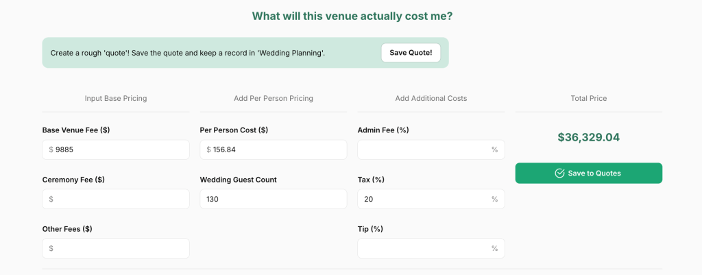 Using Tulle Together’s Venue Calculator, let’s estimate what this might cost in U.S. dollars based on the provided fees.
