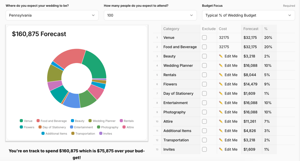The Cost Forecast Tool is just one of Tulle Together’s budgeting resources. On the website, you’ll find a variety of budget tools designed to help couples plan out their total wedding costs before they book anything. Whether you’re estimating expenses, tracking your spending, or looking for real venue pricing, Tulle Together’s tools provide a transparent approach to wedding budgeting—so you can plan confidently and avoid unexpected surprises. Sign up here for a smarter way to plan your wedding!