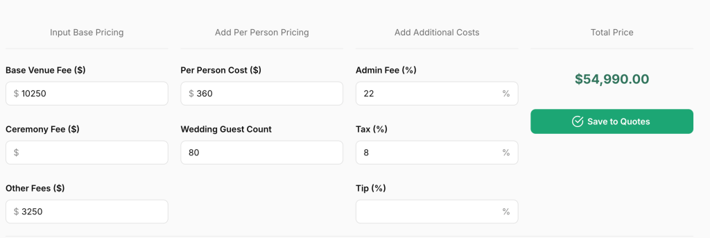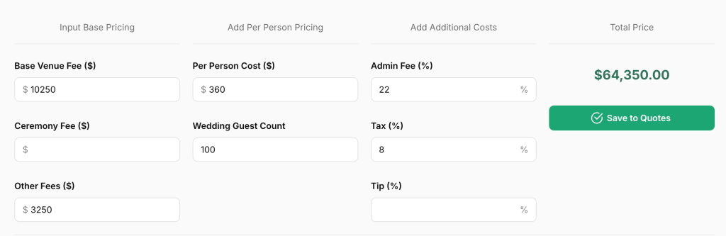 Let’s start with some total numbers before breaking down each fee individually. We combed through all the pricing details in the PDF to put together some high level quotes using Tulle’s Venue Calculator tool. This tool allows you to put in the most common elements of venue pricing PDFs to figure out the actual total without having to build a complex spreadsheet.