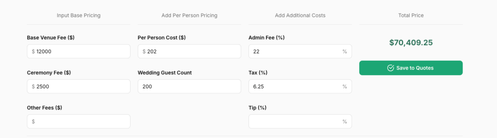 Let’s start with some total numbers before breaking down each fee individually. We combed through all the pricing details in the pricing PDF to put together some high level quotes using Tulle’s Venue Calculator tool. This tool allows you to put in the most common elements of venue pricing PDFs to figure out the actual total without having to build a complex spreadsheet.