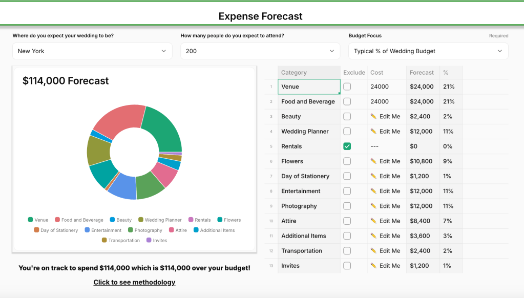 The Cost Forecast Tool is just one of Tulle Together’s budgeting resources. On the website, you’ll find a variety of budget tools designed to help couples plan out their total wedding costs before they book anything. Whether you’re estimating expenses, tracking your spending, or looking for real venue pricing, Tulle Together’s tools provide a transparent approach to wedding budgeting—so you can plan confidently and avoid unexpected surprises. Sign up here for a smarter way to plan your wedding!