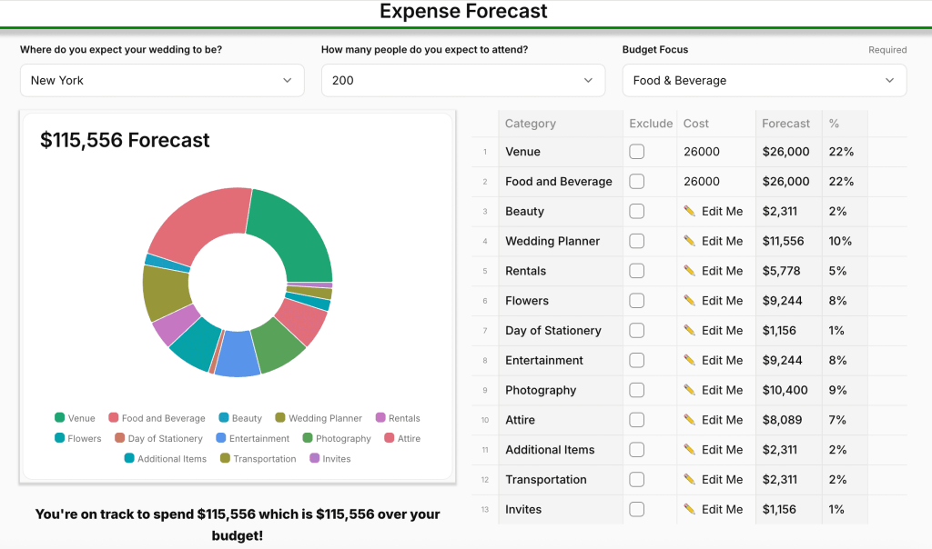 The Cost Forecast Tool is just one of Tulle Together’s budgeting resources. On the website, you’ll find a variety of budget tools designed to help couples plan out their total wedding costs before they book anything. Whether you’re estimating expenses, tracking your spending, or looking for real venue pricing, Tulle Together’s tools provide a transparent approach to wedding budgeting—so you can plan confidently and avoid unexpected surprises. Sign up here for a smarter way to plan your wedding!