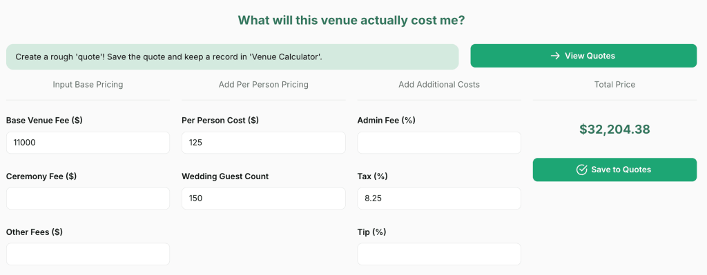 Using the pricing details in the PDF, we put together some high level quotes using Tulle’s Venue Calculator tool. This tool allows you to put in the most common elements of venue pricing PDFs to figure out the actual total without having to build a complex spreadsheet.
