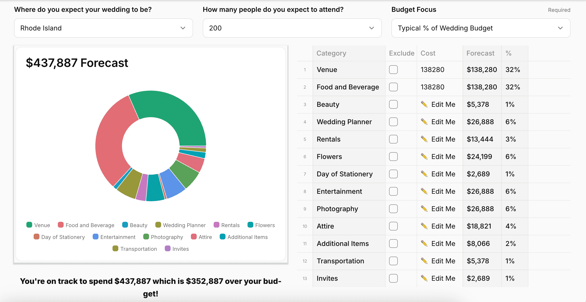 If you add up the venue fee, required room block, food & beverage cost with the lowest tier plate package for 200 people, and tax, you’re looking at a cost of around $276,561.