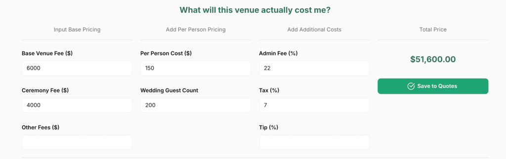 The Cost Forecast Tool is just one of Tulle Together’s budgeting resources. On the website, you’ll find a variety of budget tools designed to help couples plan out their total wedding costs before they book anything. Whether you’re estimating expenses, tracking your spending, or looking for real venue pricing, Tulle Together’s tools provide a transparent approach to wedding budgeting—so you can plan confidently and avoid unexpected surprises. Sign up here for a smarter way to plan your wedding!