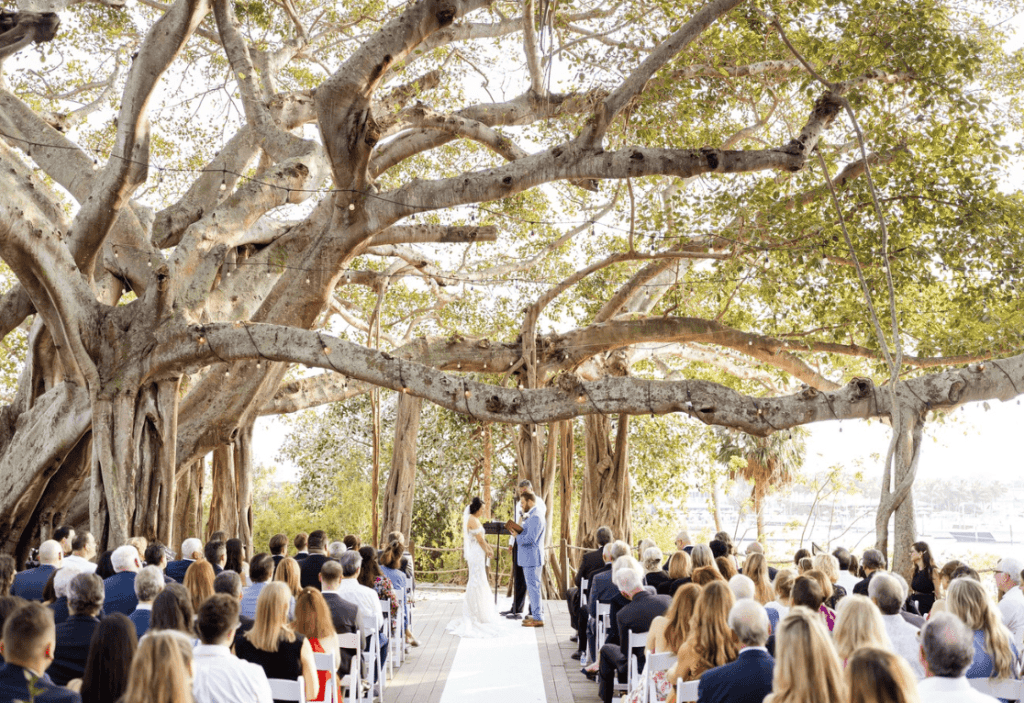 At the Jupiter Inlet Lighthouse & Museum, ceremonies take place on the Lighthouse Deck—a magical, tree-shaded space nestled beneath a towering Ficus tree planted in the 1930s. The tree frames the aisle beautifully, offering both shade and a dramatic, natural canopy. From this deck, couples exchange vows with the 1860 Jupiter Lighthouse as their backdrop and the sparkling inlet waters just beyond. It’s a truly iconic Florida setting.