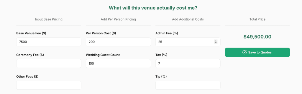 The Cost Forecast Tool is just one of Tulle Together’s budgeting resources. On the website, you’ll find a variety of budget tools designed to help couples plan out their total wedding costs before they book anything. Whether you’re estimating expenses, tracking your spending, or looking for real venue pricing, Tulle Together’s tools provide a transparent approach to wedding budgeting—so you can plan confidently and avoid unexpected surprises. Sign up here for a smarter way to plan your wedding!