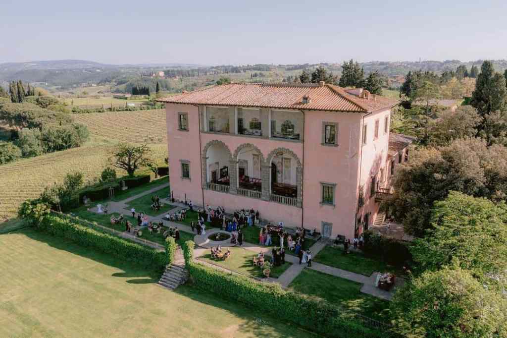Villa Mangiacane is a Renaissance estate set in the Chianti hills near Florence, originally built for the Machiavelli family and widely attributed to Michelangelo. Today, the villa is available exclusively for private buyouts, making it a strong fit for couples planning a high-end, multi-day destination wedding. For 2026, full property rentals accommodating up to 60 guests start at €30,800 per night in high season (mid-May to mid-October) and €26,400 per night in low season, plus VAT, with a three-night minimum stay required. Smaller weddings can opt to rent only the main villa (sleeping up to 22 guests), with nightly rates starting at €17,600 in high season and €13,200 in low season, plus VAT. Rates include daily housekeeping, daytime concierge service, Wi-Fi, parking, and welcome drinks, while catering, breakfasts, and certain amenities are priced separately. Given the nightly rental model and guest capacity, Villa Mangiacane is best suited for luxury weddings where accommodation and venue are combined into a single private estate experience.