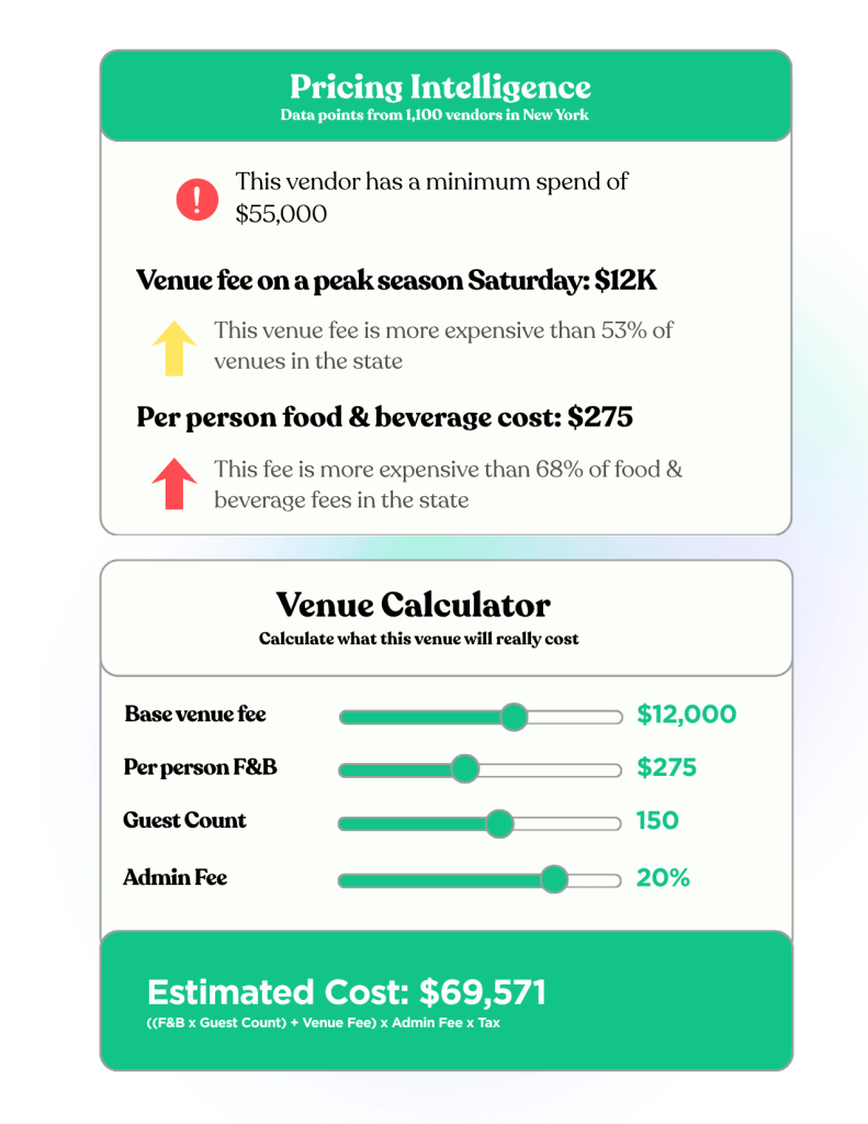 With more than 5,600 quotes, we’ve also launched an AI-powered Pricing Intelligence tool that helps you understand how venue costs compare to others in the area.
